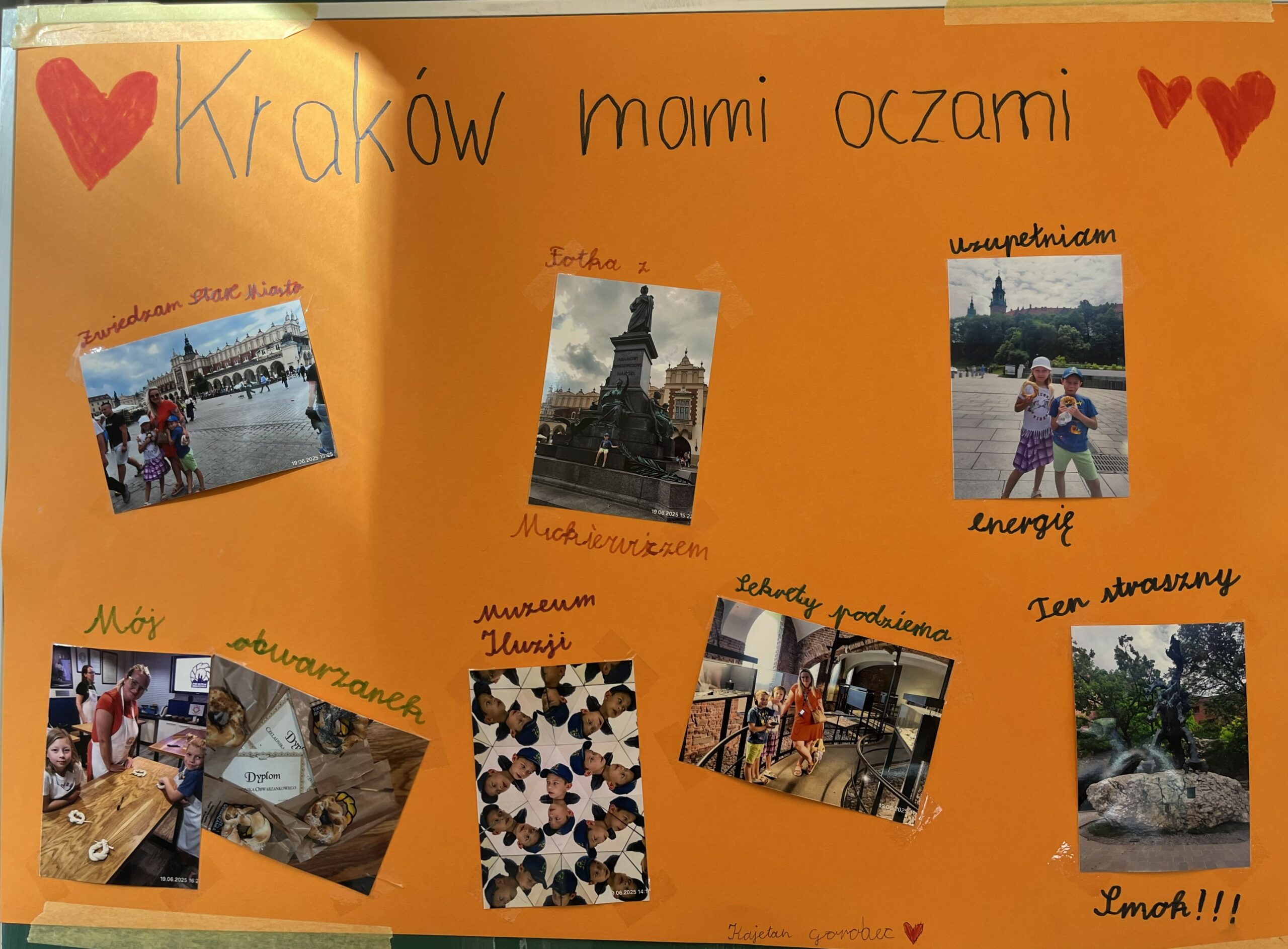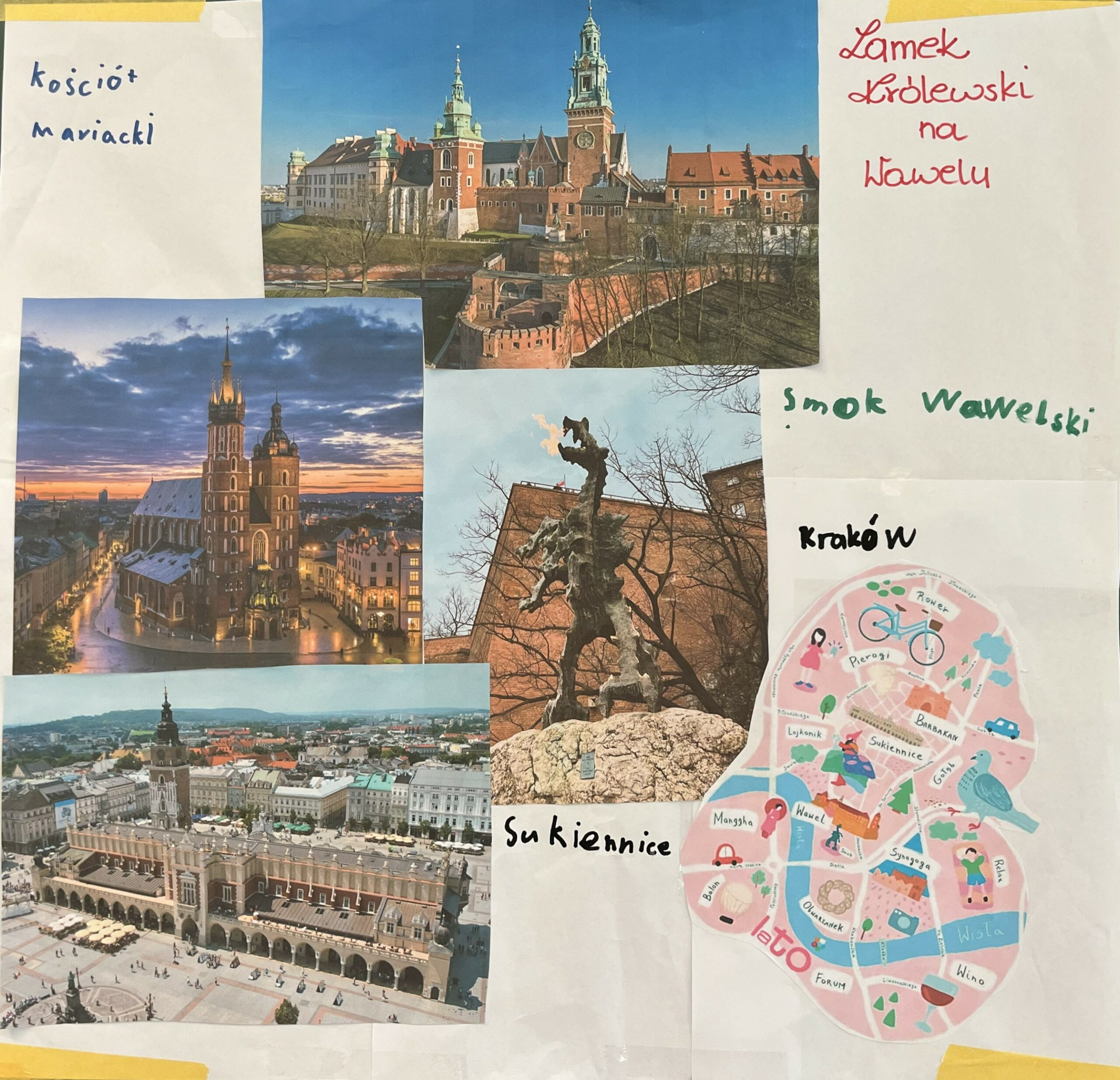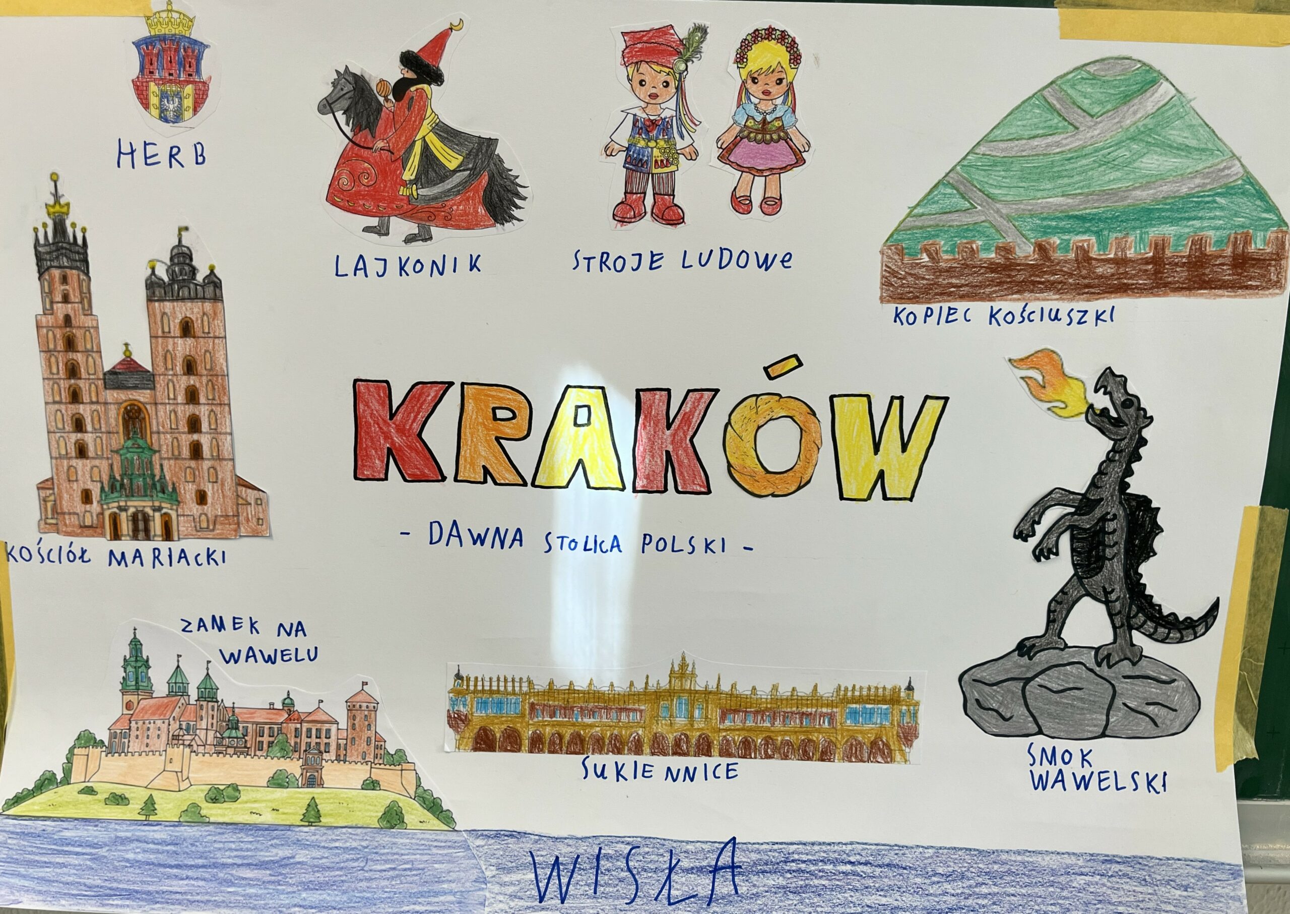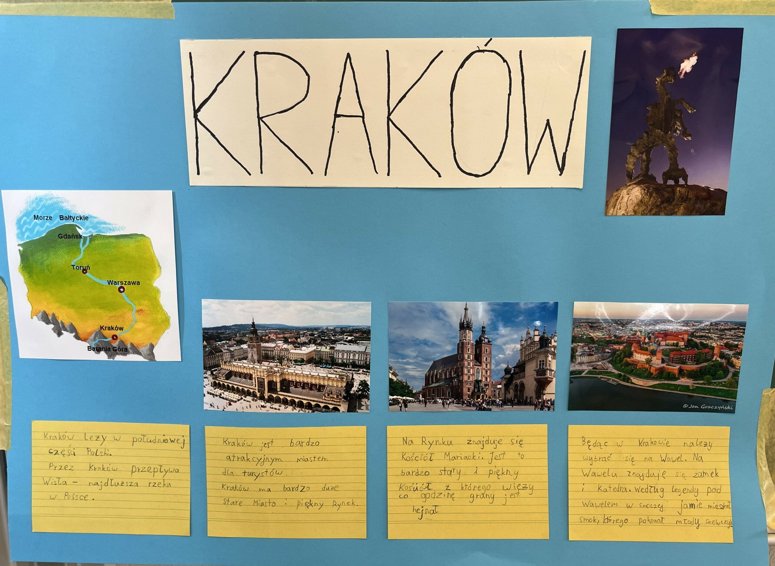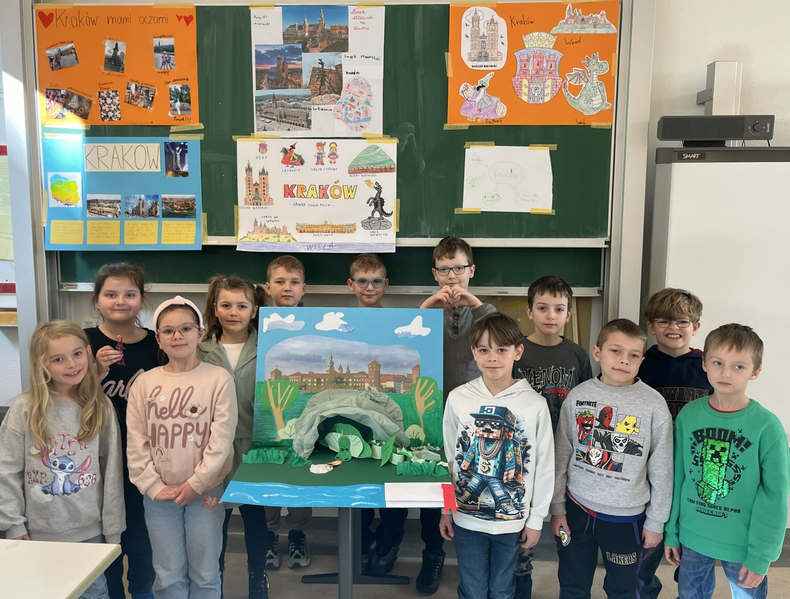 Uczniowie klasy pierwszej przygotowali w domu projekty o Krakowie, a podczas dzisiejszej lekcji zaprezentowali je kolegom z klasy. Powstały różnorodne prace przedstawiające historię miasta, jego zabytki oraz najciekawsze miejsca, a uczniowie z dużym zaangażowaniem opowiadali o wybranych przez siebie tematach.